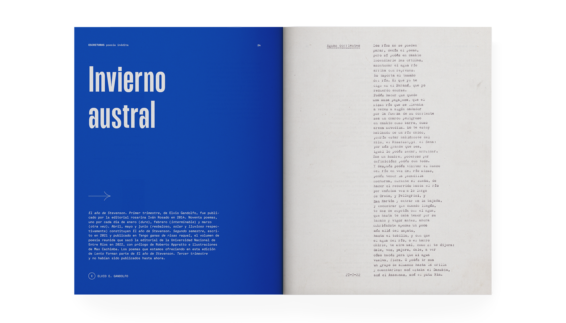 La nueva revista Lento es polifonía organizada, ideas que se comparten por medio de un sistema accesible y a la vez coherente con la diversidad y singularidad de sus escrituras. El rediseño de Lento se concibió con énfasis en la creación de una atmósfera sensible que invite a la lectura, que complemente las escrituras y que dialogue con ellas de una forma multidireccional, abriendo espacios de imaginación instituyente.